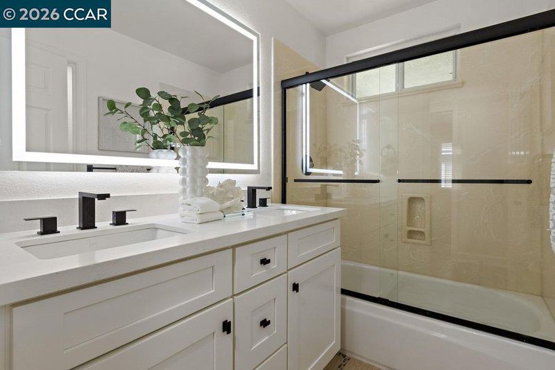 - Shower Over Tub, Stall Shower, Tile, Updated Baths, Double Vanity, Stone