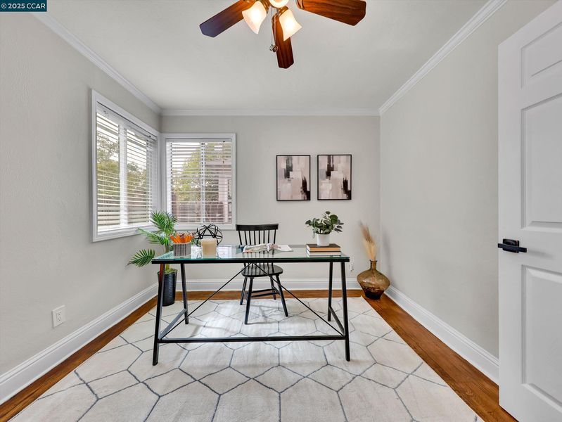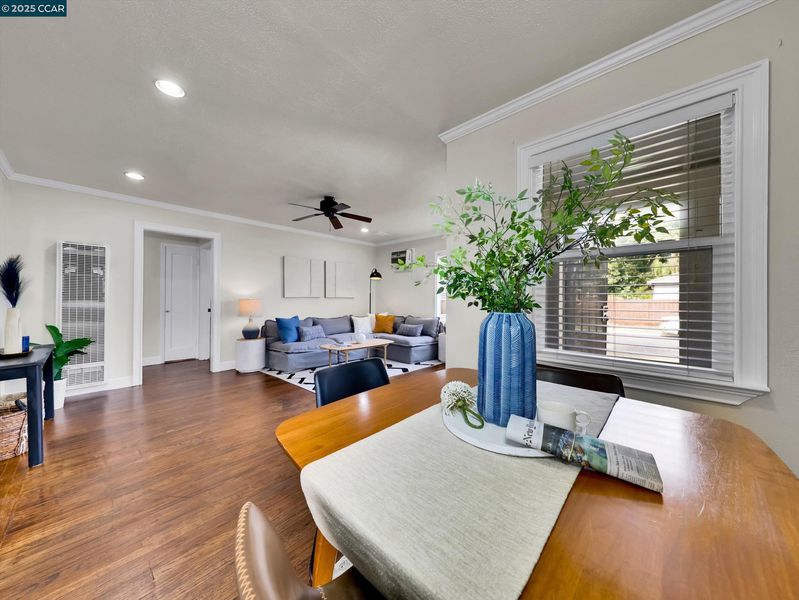 The cutest thing...in Concord! updated Mid-century, one-story house featuring 3 bedrooms, 1 bathroom, 1-car garage at Crawford Village subdivision, conveniently and centrally located from only 2 blocks away from Concord BART station, ideal for commuters. Enclosed entry porch with a "mudroom". New 30 year-roof system, original hardwood floors throughout, double pane windows. Updated kitchen with solid quartz counter tops. Upgraded bathroom. Tankless, energy-efficient water heater. Enjoy the installed fast fiber optic internet. Relax in the large, low-maintenance private and soothing backyard's serene setting, showcasing a custom-made stamped concrete patio. Superb location, within walking distance to Concord Downtown, business district, shopping, restaurants, parks, in close proximity to 242, 680 & Hwy 4 freeways, public transportation and an array of different community services. Virtual tour at https://my.matterport.com/show/?m=n11LShcbL5Z