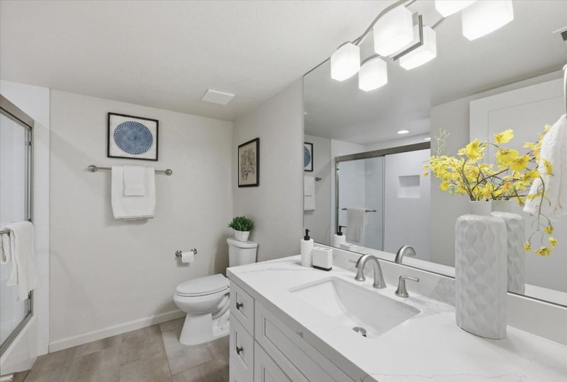 A Sanctuary of Contemporary Luxury! Step into a beautifully remodeled in 2021, top-floor condo where natural light and modern design converge. The expansive living room features vaulted high ceilings and recessed lighting throughout, creating an atmosphere of effortless sophistication. An elegant chandelier elevates the space, guiding your attention to a glass sliding door that opens to a sunny, covered outdoor patio with open green view. The remodeled and open kitchen is a testament to style, featuring shaker-style cabinets, sophisticated quartz counters, and stainless steel appliances. Retreat to the spacious primary suite with ample closet space, an updated vanity and countertop, complete with a shower with tile surround and glass enclosure. A guest bathroom features a newer shaker-style vanity, and quartz countertop, ensuring both comfort and style for your guests. Additional features include: Indoor washer & dryer, central heating and air conditioning, elegant single panel interior doors, natural lighting throughout and 2-car tandem garage. Prime location in the back of a well maintained complex with swimming pool, club house & convenient to park, shopping, downtown Mountain View & Sunnyvale, near Apple and Linkedin + easy access to freeway & expressway. You will love it !