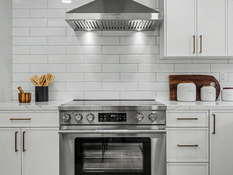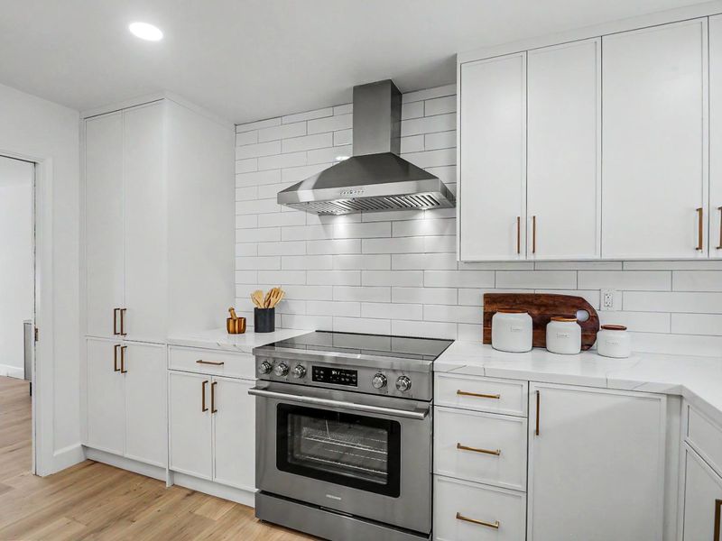- 220 Volt Outlet, Cooktop - Electric, Countertop - Quartz, Dishwasher, Hood Over Range, Ice Maker, Oven Range - Electric, Pantry, Refrigerator, Skylight