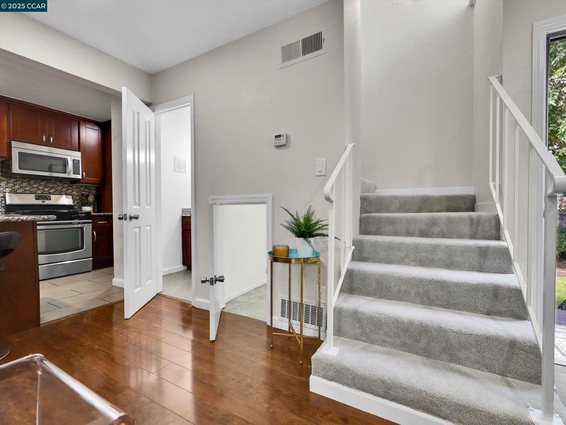 End unit, bright & airy, 2-story condo/townhouse style at Comstock Gardens featuring 2 bedrooms, 1.5 bathrooms with plenty of renovations to accommodate modern living. No neighbors below or on top of unit. Double pane windows with new coverings. Remodeled, upgraded kitchen with gas stove & granite counter tops. LED, energy efficient recessed lights on ceilings. Wood laminated floors. New stairway carpets. Central AC and heating systems. 1-car garage directly underneath with remote control access and additional storage closet. Community pool. Hot water service included within HOA fees. This unit is located in close proximity to shopping, public transportation and a variety of community services. Virtual tour at https://my.matterport.com/show/?m=u4Lg2xyzkd5