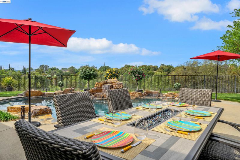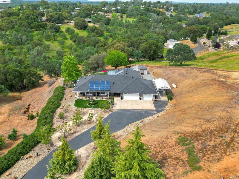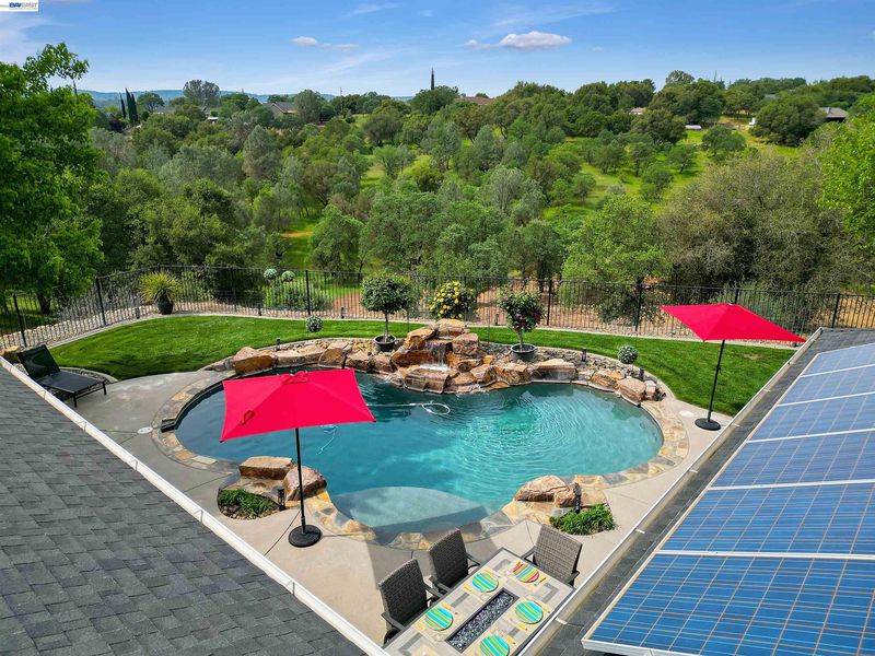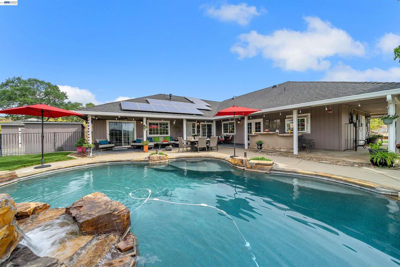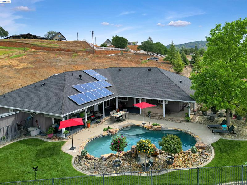 Private foothill retreat on 3.5 acres in scenic Copperopolis. This beautifully updated home offers 4 bedrooms, 3 bathrooms, within 2,570± sq. ft. of comfortable living space with updated flooring throughout, a remodeled kitchen, and updated baths. The inviting family room features a gas fireplace and doors leading to the backyard, creating ideal indoor-outdoor living. The spacious primary suite includes a gas fireplace, ensuite with a jetted tub, separate shower, and double sinks. Ceiling fans are located throughout the home, and a convenient hall bath offers direct access to the pool area. Step outside to a private backyard oasis featuring a pool with waterfall, fenced with covered patio, and built-in BBQ with refrigerator—perfect for entertaining. The landscaped grounds include fruit trees and plenty of usable acreage for horses, gardening, and/or recreation. Additional highlights include paid solar, a deep well with home water filtration system, 3-car garage, covered RV/boat storage, storage shed and extended paved driveway. Enjoy private access to Lake Tulloch for boating, swimming and fishing, plus nearby parks, golf, shopping, dining, schools, and medical services, all just minutes away.