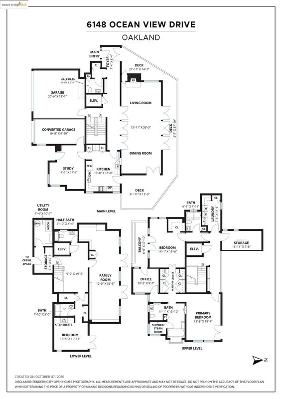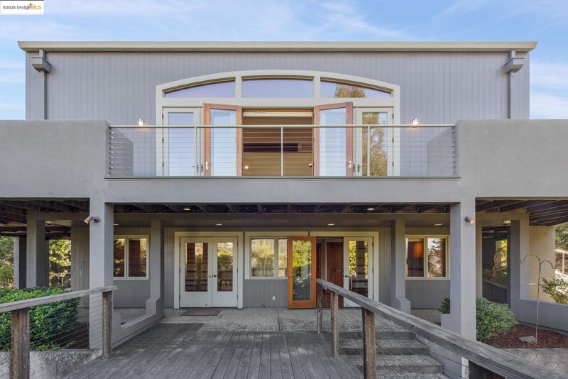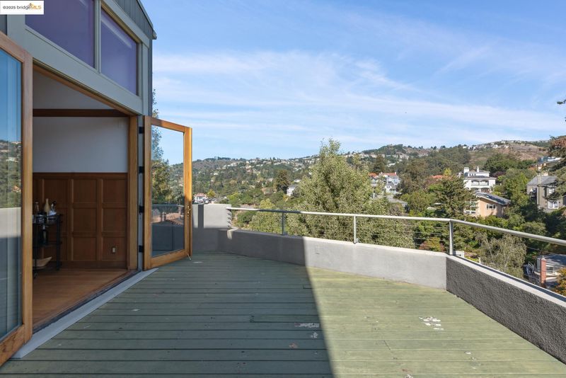 Dramatic modern home, defined by its bold geometry and contrasting wood and stucco facade. An elevator navigates between its three levels. A striking grand living-dining room spans the length of the home, and opens to a long back deck and vistas across the hills. Large kitchen with electric range and wet bar. A versatile den and one converted garage bay are adjacent for home office or studio. Upstairs a long mezzanine looks down on the main public rooms, leading to the primary suite with private office and walk-in closet. The primary bath offers curbless roll-in shower. On this level are a second bedroom with balcony, full bath, laundry room and storage. The lower floor features a family room with access to the lower patio and backyard. A bedroom and bath are configured for separated living with a private entrance. This adaptable, multi-level layout and abundant indoor-outdoor space offer enormous flexibility in Oakland's premier neighborhood.