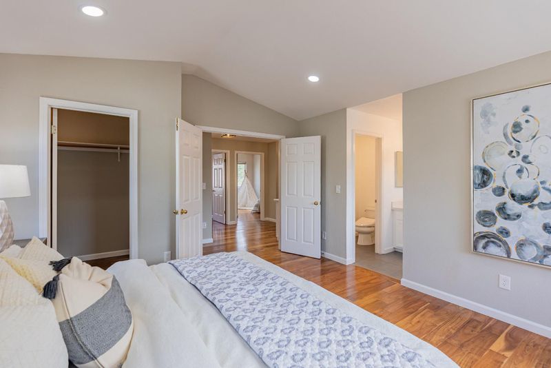 Towering 2-story stunner on a quiet corner lot just steps from Devonshire Park with its kids playground, this home combines comfort, style and convenience. Top-Rated schools are nearby and downtown Mountain View, with its lively farmers market, dining, shops and direct Caltrain/light rail connections, is only about 1.5 miles away. Inside, soaring ceilings, recessed lighting, dual-pane windows and a skylight fill the home with natural light, while warm laminate floors, central heat/AC and a cozy fireplace create an inviting atmosphere. The kitchen opens to the family room and serves as the heart of the home, showcasing high-end stainless steel appliances, quartz countertops with breakfast bar and a pantry. Upstairs, generously sized bedrooms each include their own closet, with the primary suite offering a private retreat featuring a large walk-in closet and spa-like bath with dual sinks and a stall shower. Additional highlights include an office nook overlooking the living room, a two-car garage with 240V EV charger and washer/dryer, as well as a private backyard ideal for entertaining or relaxing. Conveniently close to major tech campuses (Apple, Google, LinkedIn) and highways 85, 101 and 237, this home blends lifestyle, location and luxury. Do not miss this gem. It will go FAST!