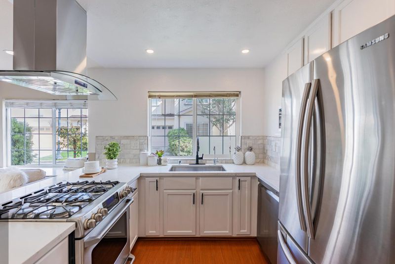 - Cooktop - Gas, Countertop - Quartz, Dishwasher, Exhaust Fan, Garbage Disposal, Hood Over Range, Oven - Gas, Oven Range - Electric, Pantry, Refrigerator