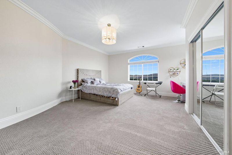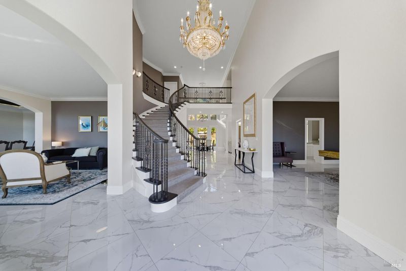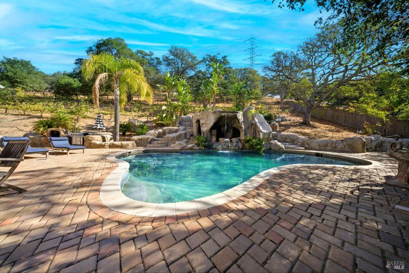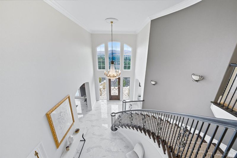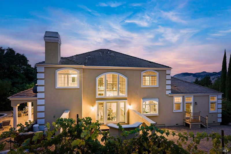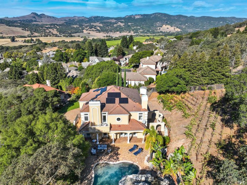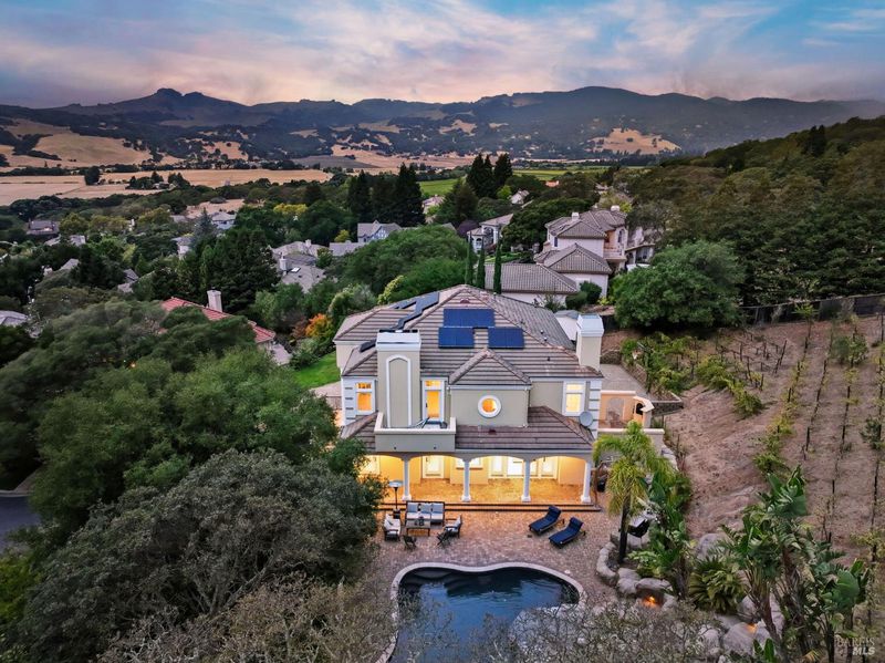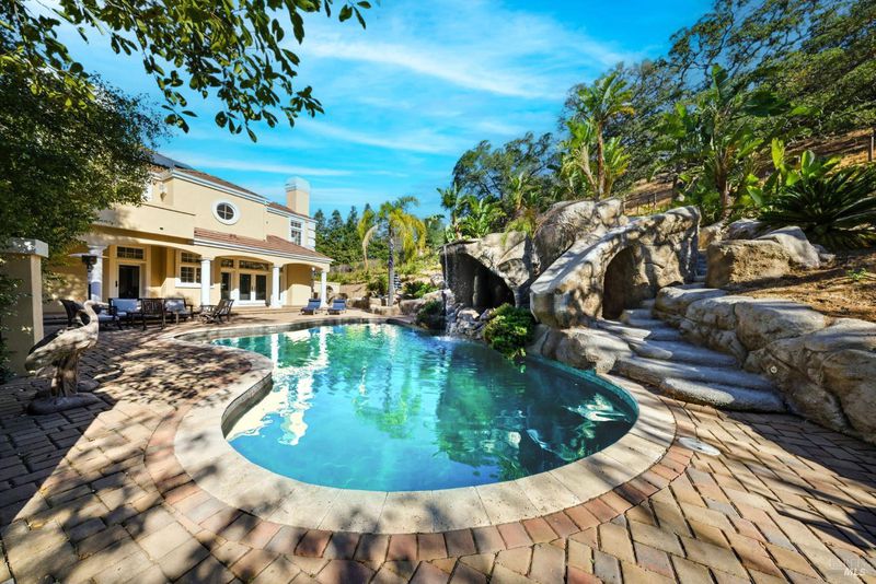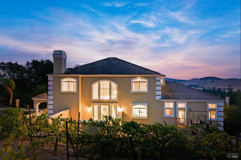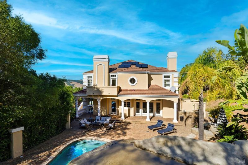 Exquisite KING of the hill home w- breathtaking panoramic views in the prestigious gated community of Eastridge. 4BD | 5BA. No rear neighbors- just majestic oaks, your own picturesque vineyard, and a resort-style pool and spa. Grand foyer with sweeping spiral staircase & soaring ceiling greets you as you walk through the designer front door. The main level includes a bedroom and a bath. Spacious chef's dream kitchen w-top of the line stainless steel appliances & a walk-in pantry. Luxurious primary suite boasts a spa-like bath, generous closet space w- a balcony. This 4,643 sqft custom beauty sits on .75 acres. Features include a sparkling heated swimming pool, waterfall, grotto, slide, and spa. Spacious 4-car garage with a driveway that curves up and around the back for easy access. Multiple fruit trees, owned solar panels, 3/fireplaces, wet bar and so much more! Enjoy stunning views from every window. This property is just moments from the Green Valley Country Club, Napa, local wineries, and all Bay Area commuter routes. Exceptional one-of-a-kind custom home. Make your dreams come true! Its pure bliss for entertainers.