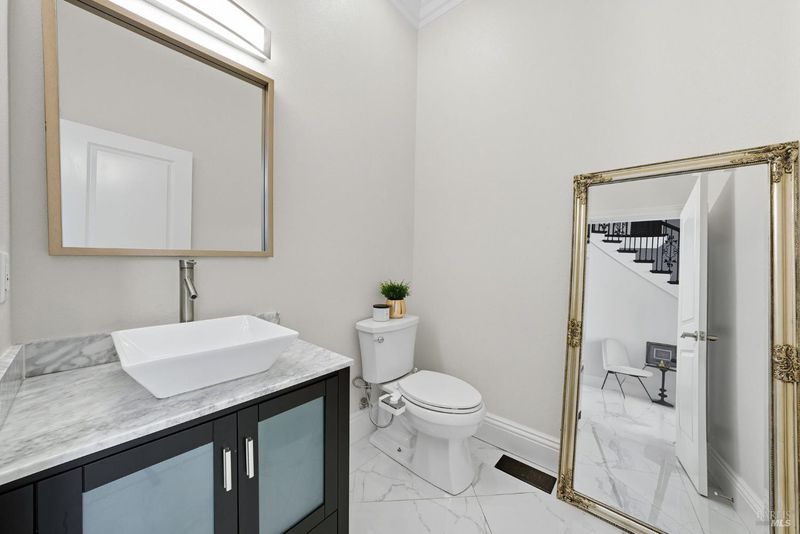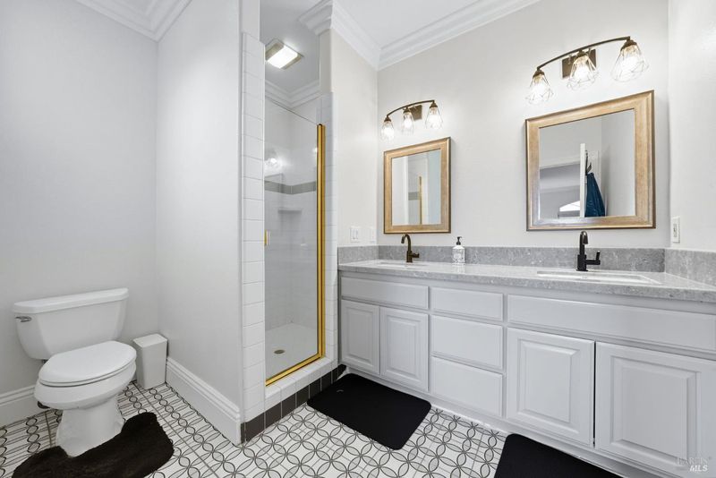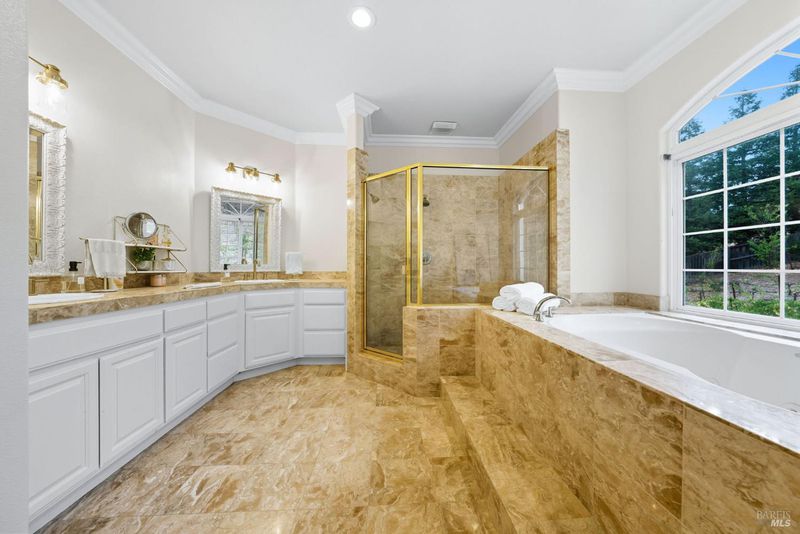 - Double Sinks, Jetted Tub, Marble, Multiple Shower Heads, Shower Stall(s), Sitting Area, Tile, Window