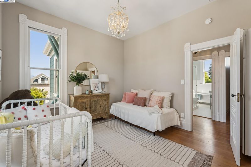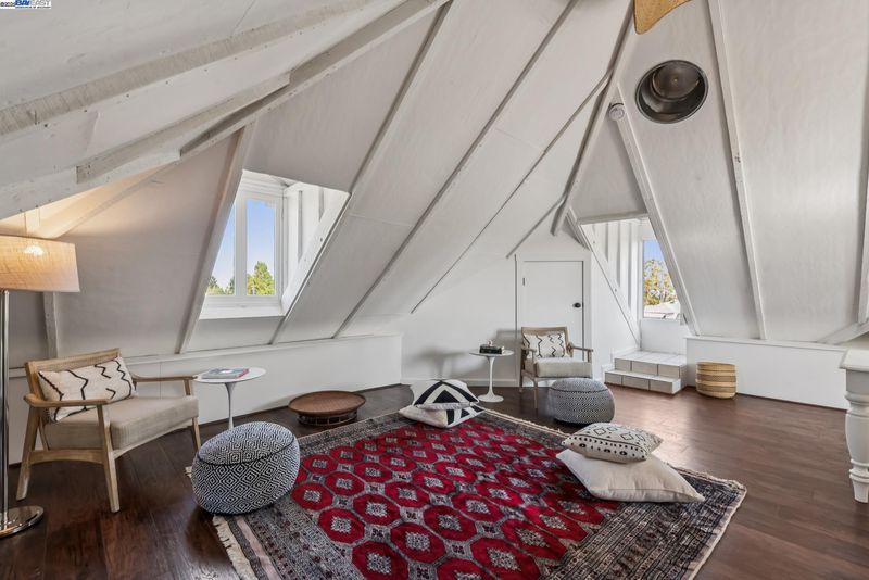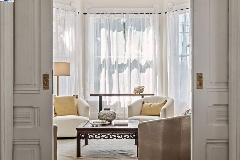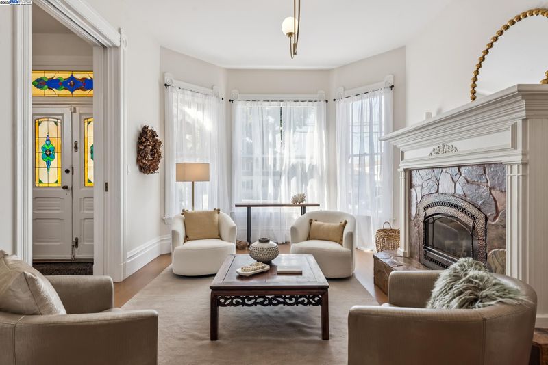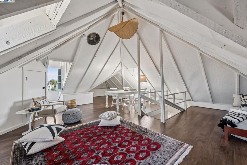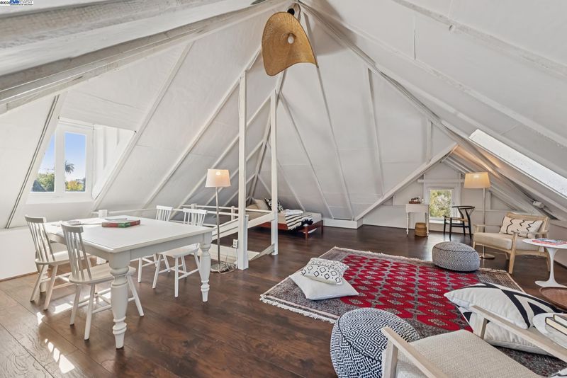 Enjoy the beauty of this majestic 4-bedroom, Alameda Queen Anne in a park-like setting. This fresh, 3000 sq. ft. light-filled home, sits on a large 7,500 sq. ft. lot and has a valuable 3-bedroom and 1-bath attached unit with a private courtyard entrance. Surrounded by lush lawns and classic terra cotta tile, it has 5 off street parking spaces and a long driveway to the rear garage with space for RV parking and an accessible full-bath The main home retains many original features with impressive soaring ceilings, pocket doors, gingerbread, and more. It features a welcoming formal entry and living room, a sought-after family room, a dining room off the kitchen, and a convenient half-bath. The modern kitchen echoes the architecture of the original home and is designed to be multi-purpose. It is equipped with five workstations, a walk-in pantry, and a laundry room. Amenities include a 6-burner Thermador gas cooktop with a pot filler, built-in oven, dishwasher, large capacity refrigerator, and a center island with an under-counter refrigerator. Picture windows offer an expansive view of the backyard. The second floor boasts 4 bedrooms and a delightful bathroom with a walk-in shower and a claw foot soaking tub. Additionally, there is approx. 660 sq. ft. of useful attic space.