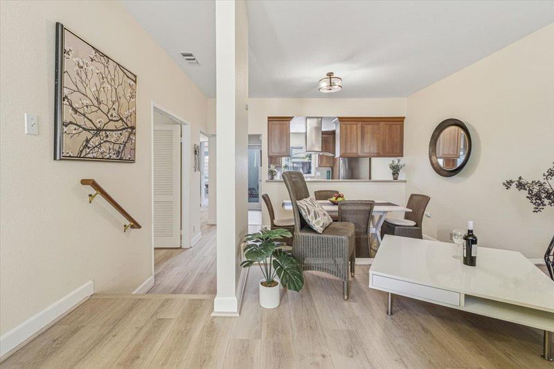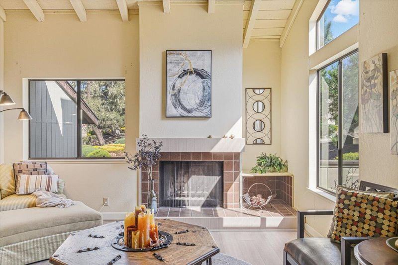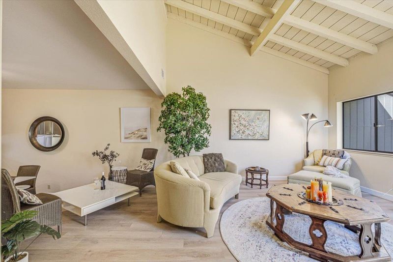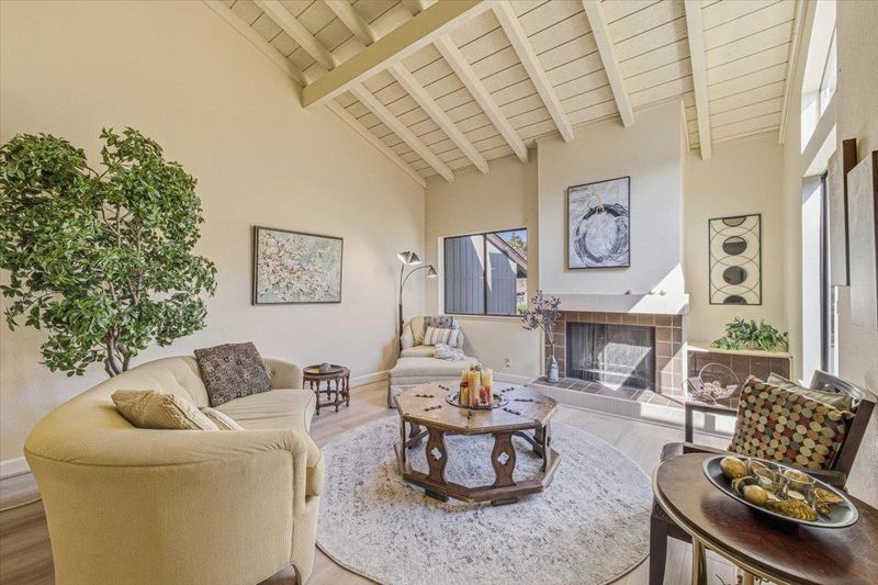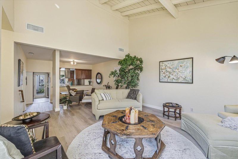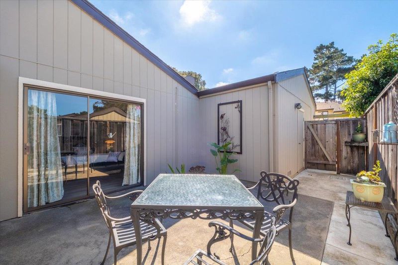 Welcome to this almost sgl level (only 2 steps inside) contemporary home in picturesque PG! Offering 1,167 sf, this condo offers 2 bedrooms and 2 full bathrooms--both with timeless updated features. A washer and dryer are included hidden in the guest bathroom. The kitchen is equipped with modern amenities, featuring solid surface Quartz countertops, gorgeous easy close cherry cabinets, a farmhouse sink and hi-end stainless appliances--a delightful space for culinary enthusiasts. The kitchen features a pass thru opening to the spacious dining area. The open beam/high ceiling design adds character to the living spaces, complemented by brand new engineered wood-like flooring throughout. Cozy up next to the fireplace during cooler evenings. There is a welcoming patio for sunny afternoons and bbqing and an oversize detached 2 car garage in back--pull into the garage with your groceries, walk through the patio into the kitchen--easy one level.