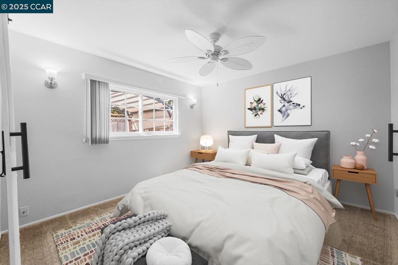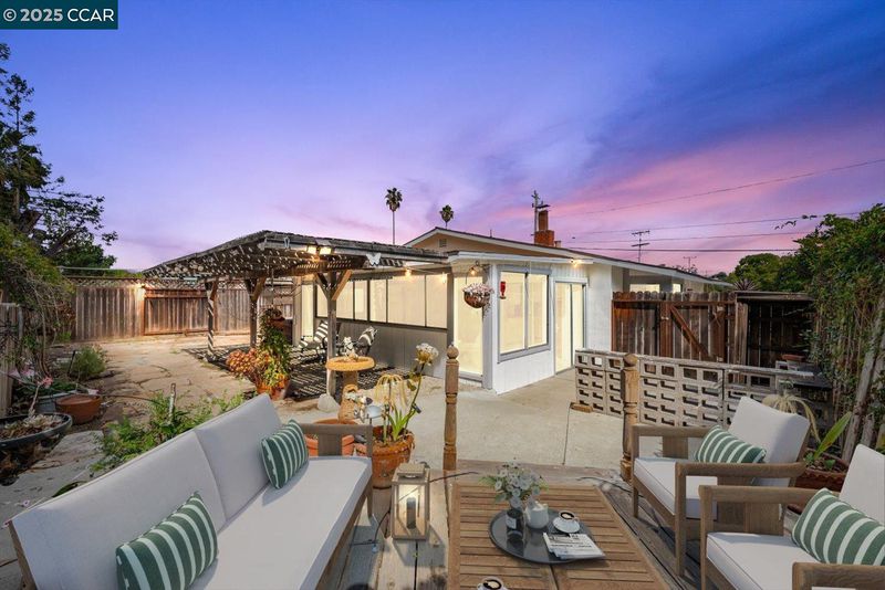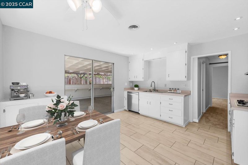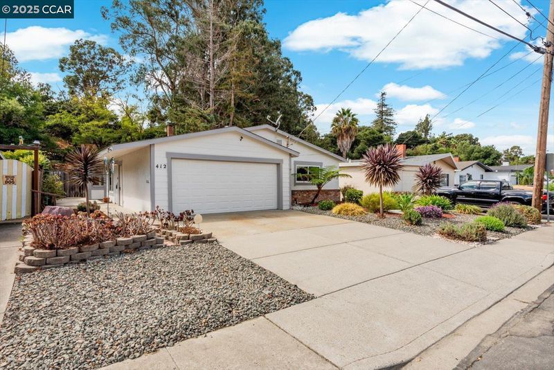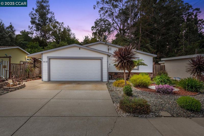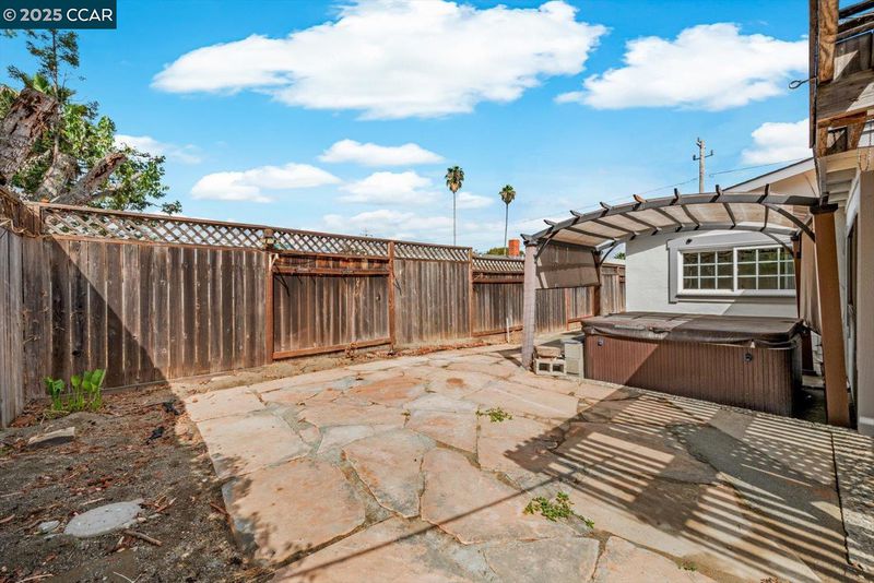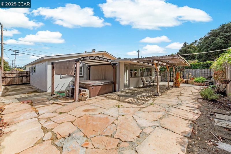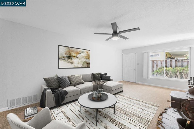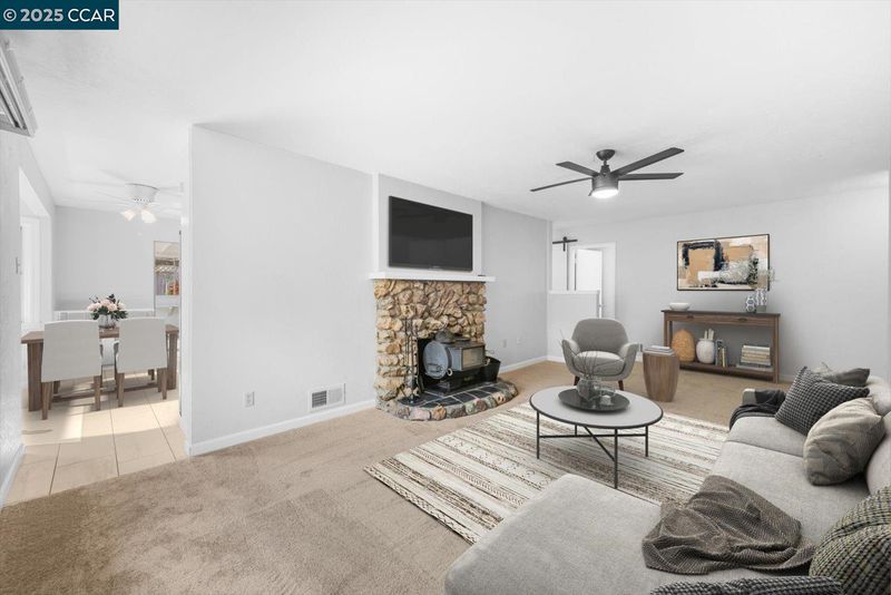 Welcome to 412 Tennent Avenue, Pinole. This four-bedroom, one-and-a-half-bath home offers 1,278 sq ft of comfortable living. The living room with wood-burning stove and stone surround flows into a bright eat-in kitchen with ample cabinetry, dining space, and refrigerator with ice maker. A sunroom at the back, filled with windows and backyard access, makes an ideal playroom, office, or hobby space, complete with dog door. New carpet runs throughout, with window blinds included. The primary bedroom features a walk-in closet and updated ensuite, while an updated half bath serves the rest of the home. Ceiling fans add comfort, and a hall pull-down ladder provides attic storage. The two-car garage offers built-in shelving, workbench, washer/dryer, and overhead storage. The low-maintenance backyard includes a covered patio and hot tub. A camera and doorbell system add security, while an additional workshop area beyond the fence provides space for storage, RV parking, or projects. Minutes from the shoreline, Bayfront Park, Fernandez Park, Pinole Creek trails, Senior Center, Historic Downtown, and San Pablo Avenue dining and shopping, with easy freeway access for commuting. Virtually staged.