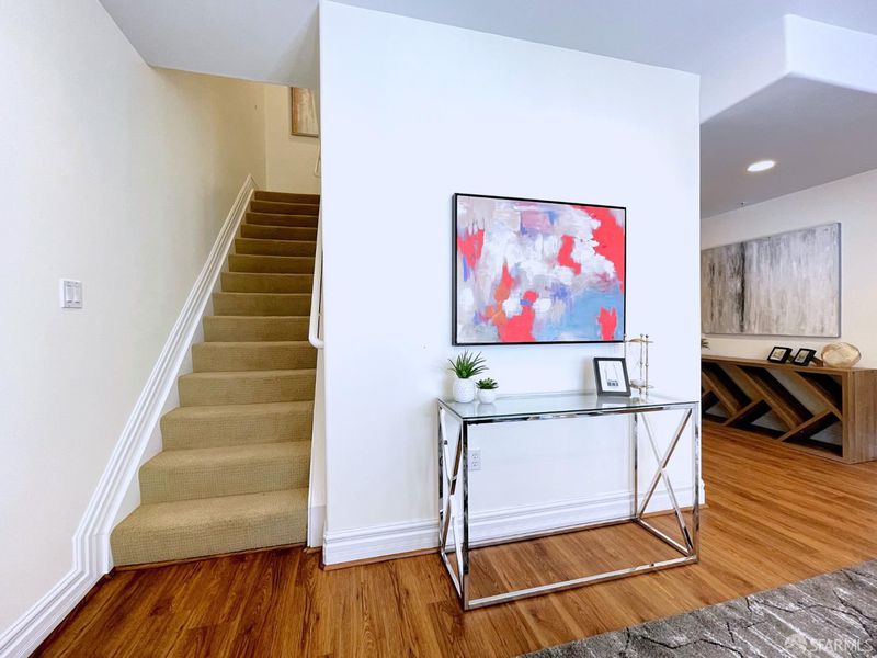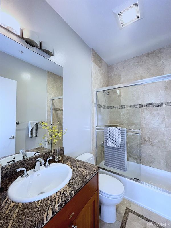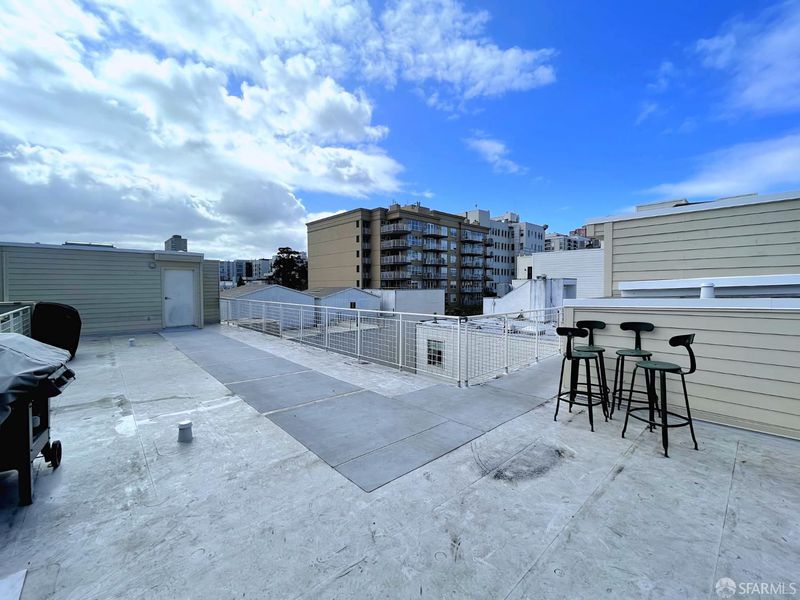This stunning 2-bed, 2.5-bath, two-level condo offers modern city living at the border of Pacific Heights and Russian Hill, just steps from vibrant dining and retail on Pacific and Polk. The open floor plan features vinyl/wood floors, recessed lighting, and custom finishes. A private patio at the front entering into the spacious dining room, followed by a gourmet kitchen with granite countertops and stainless steel appliances. A gas fireplace in the cozy living room. The upper level includes 2 en-suite bedrooms and a laundry closet. A large, shared rooftop deck offers breathtaking views of the Golden Gate Bridge, San Francisco Bay, Marin Headlands, and the city skyline, ideal for relaxing or entertaining. The professionally managed building includes an elevator, secured lobby, and assigned parking. Situated in the heart of eclectic Polk Street, this home seamlessly blends luxury, convenience, and style in a sought-after neighborhood.
