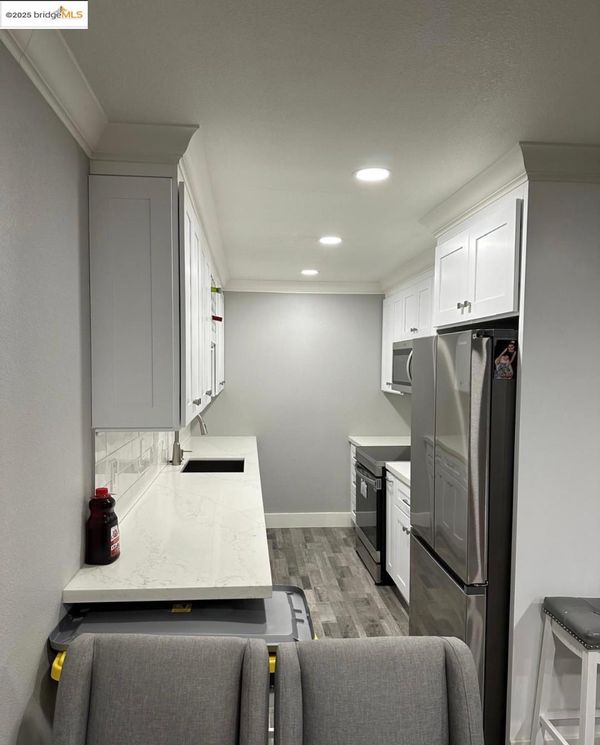 Fabulous, Updated Condo on the second floor. kitchen is updated with white cabinets, quartz counter tops with white sub way tiles back splash, laminate flooring with stainless steel appliances. Laminate floors throughout. Updated bathroom with tiled bathroom floors. Newer paint throughout. Balcony overlooking the community pool. close to Bart and walking distances to shops and restaurants.