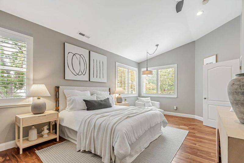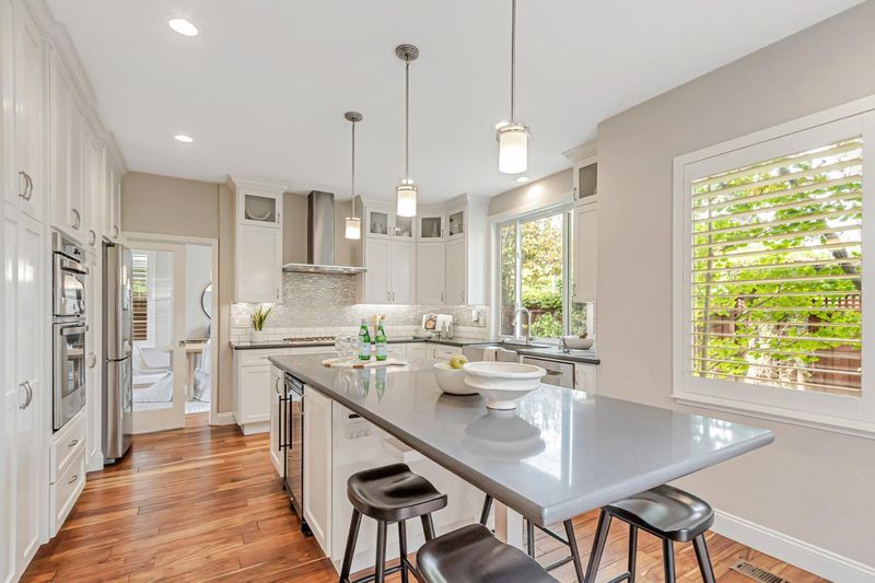 Welcome to 1433 Selborn Place in the desirable Rose Garden. The spectacular foyer, soaring ceilings, spiral staircase and the formal living/dining areas sets the scene for this exquisite home. Rich Acacia hardwood floors, plantation shutters and an abundance of sun-lit windows. The heart of the home is the updated chef's kitchen which is connected to the generous family room. The kitchen has custom cabinetry, a Thermador gas stove, and an eat-in island overlooking the serene yard. The primary suite includes a sitting area, dual walk-in closets and a luxurious updated bathroom with a steam shower and an Americh whirlpool air tub. One bedroom has built-in shelving, a desk, and Murphy bed to accommodate a home office and guests. Green features: Owned Tesla solar and dual power walls, EV charger, dual-zone HVAC, and whole-house fan. Smart home includes: Ring video doorbell, door locks, garage door opener, sprinkler system, and thermostats. Superb location for commuters to Santa Clara and Cupertino with easy access to highways, train stations, and SJ airport. Blocks to local amenities such as the Rose Garden Park, Zanottos, Starbucks, local schools, Bills Cafe and the library. < 2 miles to shopping at Valley Fair, Santana Row, Whole Foods. Easy access to local healthcare.