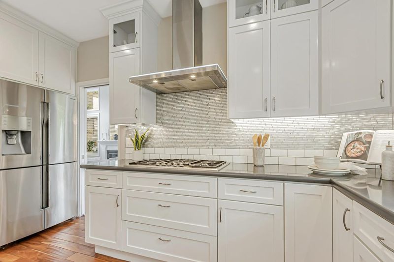 - Cooktop - Gas, Countertop - Quartz, Dishwasher, Exhaust Fan, Garbage Disposal, Hookups - Gas, Island, Microwave, Oven - Built-In, Refrigerator, Wine Refrigerator