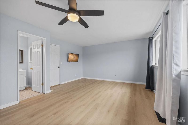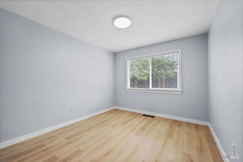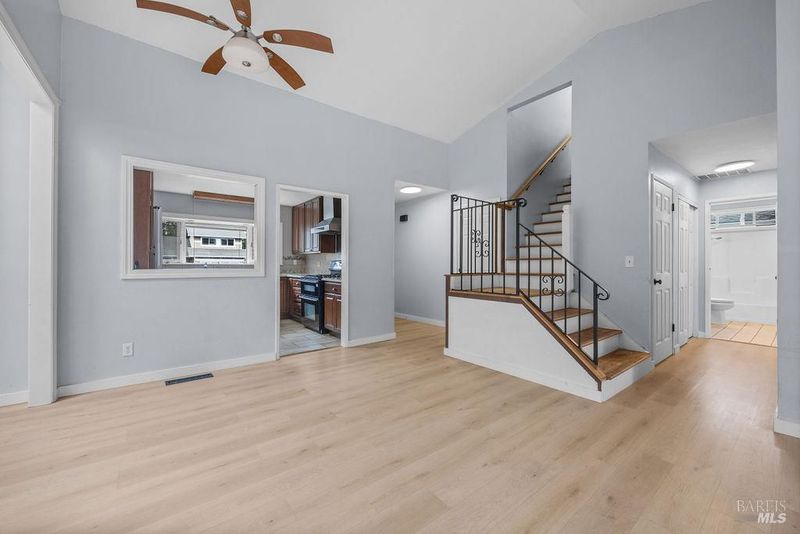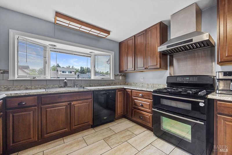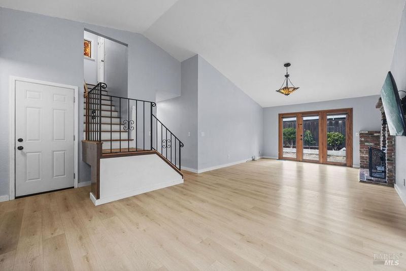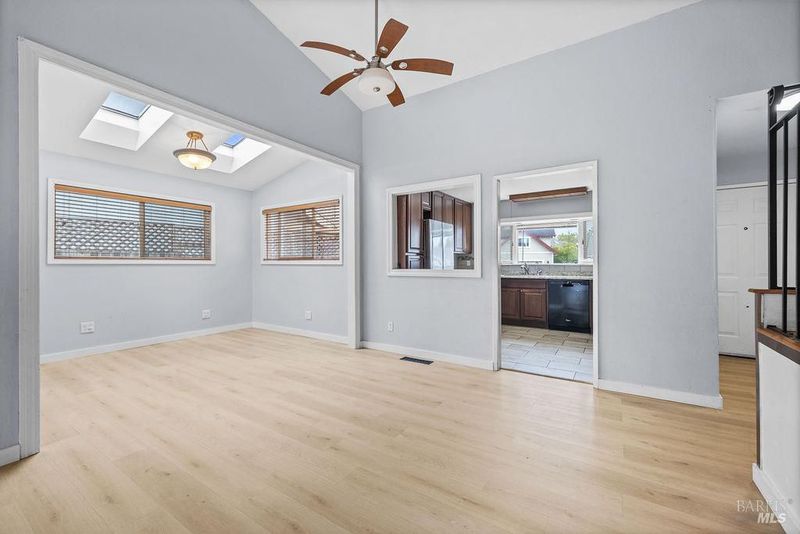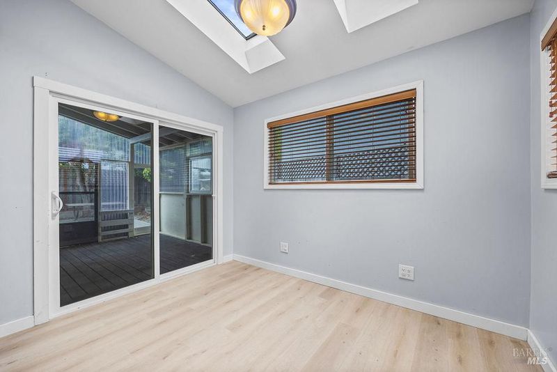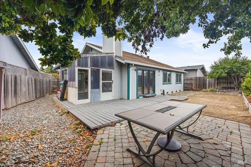 Tucked at the end of a quiet cul-de-sac, this 3BD/2BA home offers 1,446 sq ft of well-designed living space on a 5,401 sq ft lot. The vaulted-ceiling living room features a vintage brick fireplace and triple French doors that open to a private backyard, creating great natural light and indoor-outdoor flow. The kitchen includes a bay window, rich cabinetry, and 5-burner range. Adjacent dining room has a skylight and sliders to a sunroomperfect as a play area, office, or morning retreat. Two bedrooms and a full bath are on the main level, plus generous hallway storage. Upstairs, the spacious primary suite offers dual closets, ceiling fan, and an ensuite bath. Outside, enjoy a wood deck, mature fruit trees, and room to garden or entertain. One-car garage plus 2-car driveway. Convenient location near shopping, dining, Honeybee Pool, Foxtail Golf Club, Golis Park, Sonoma State, and HWY 101. A rare blend of charm, function, and location.