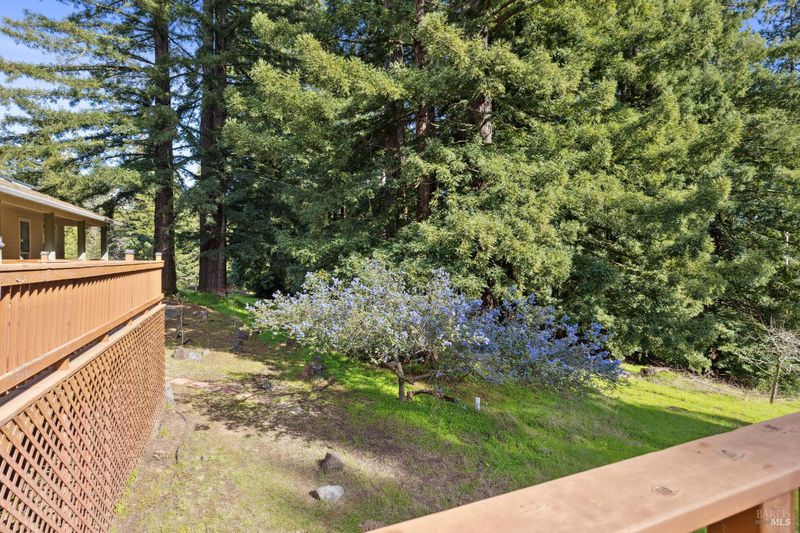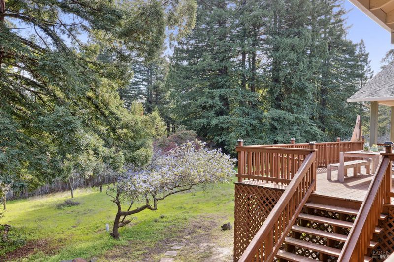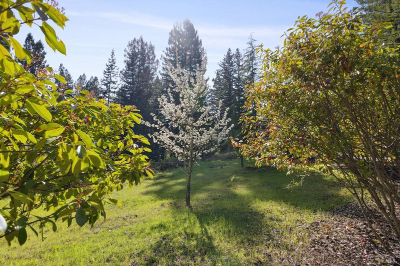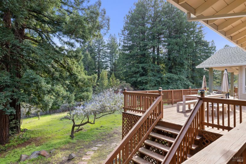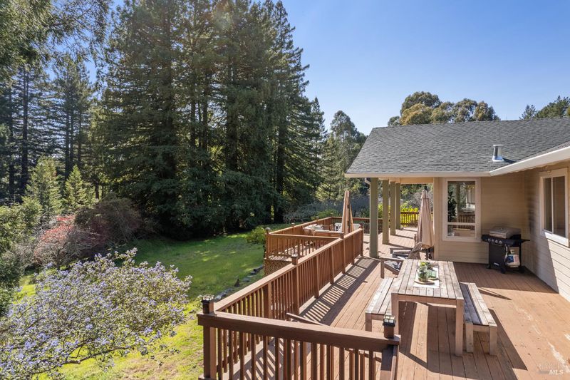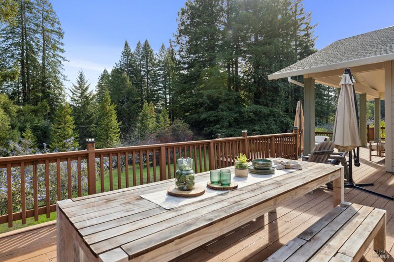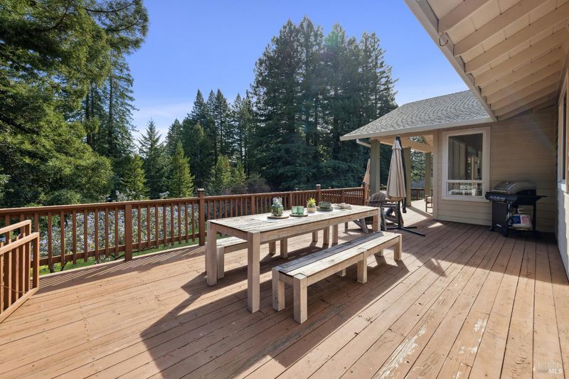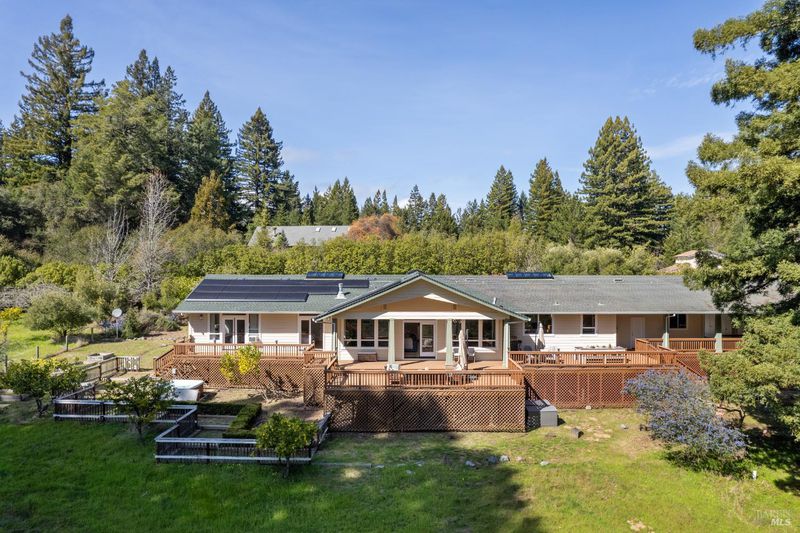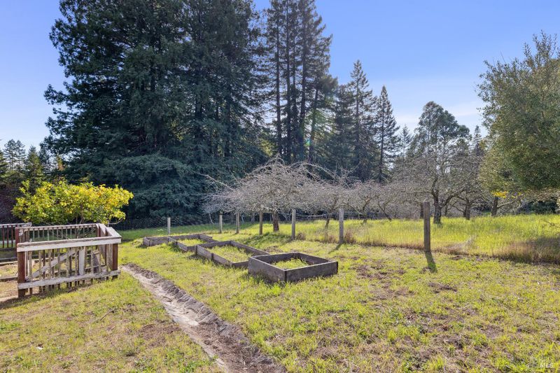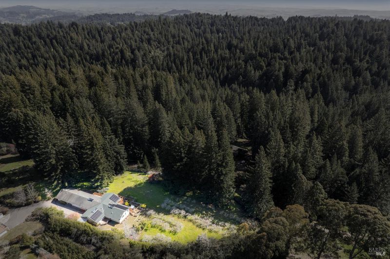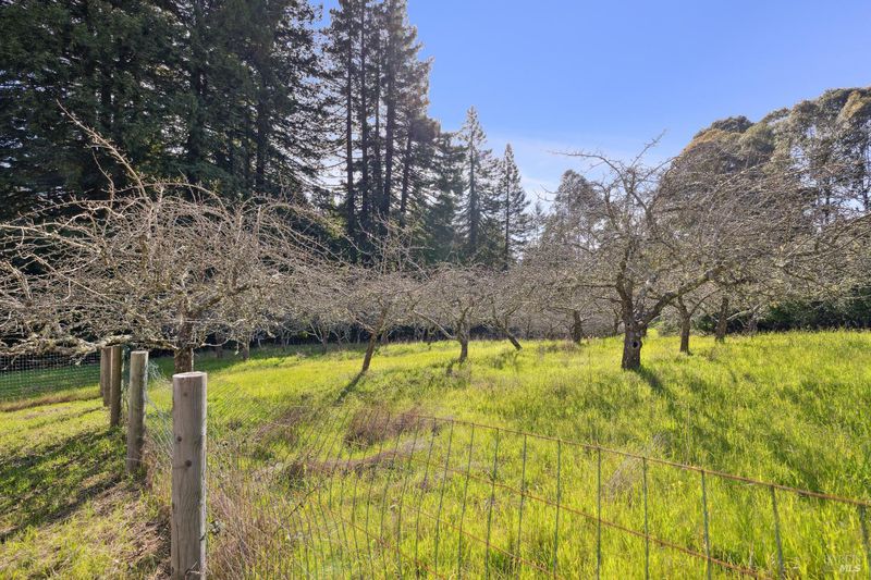 Surrounded by towering redwoods, this 5-acre property offers a stunning natural landscape with the perfect mix of shade and sun. A mature orchard features 75 fruit trees, including the famous Gravenstein apple, and the front meadow offers an abundance of delicious blackberries in the summer and fall. As you enter the home, a large covered porch greets you as you make your way towards the entry. Inside, you'll find an expansive living area with high ceilings and abundant natural light. The kitchen boasts granite countertops, custom cabinetry and premium appliances. The primary suite is a tranquil retreat with high ceilings and doors opening onto the deck. The ensuite bathroom provides a spa-like experience with two separate vanities, a soaking tub and a large walk-in shower. A spacious second bedroom features its own bathroom with a large vanity, and a separate shower and water closet. An additional den/flex space features a desk area and French doors leading to the patio. An additional unique feature of this home is the private legal studio perfect for guests. Modern amenities include high-speed internet, solar, and Tesla Powerwall. The close proximity Occidental and Bodega Bay makes this home an incredible find.