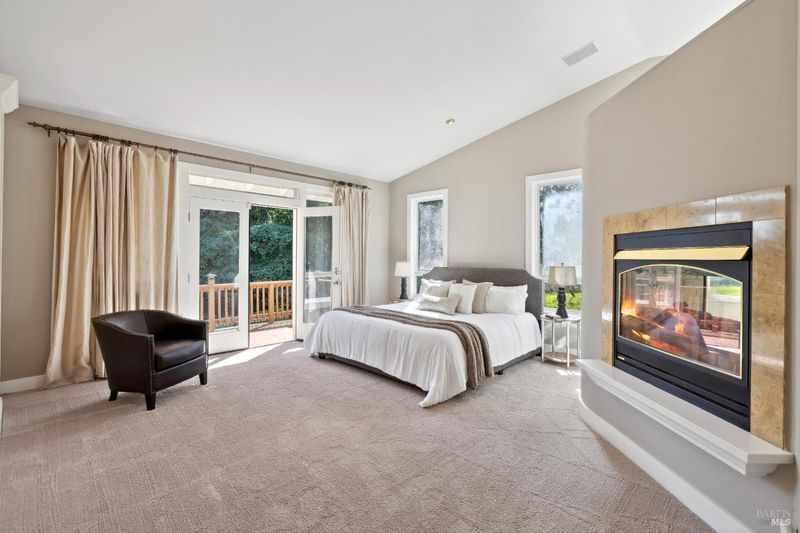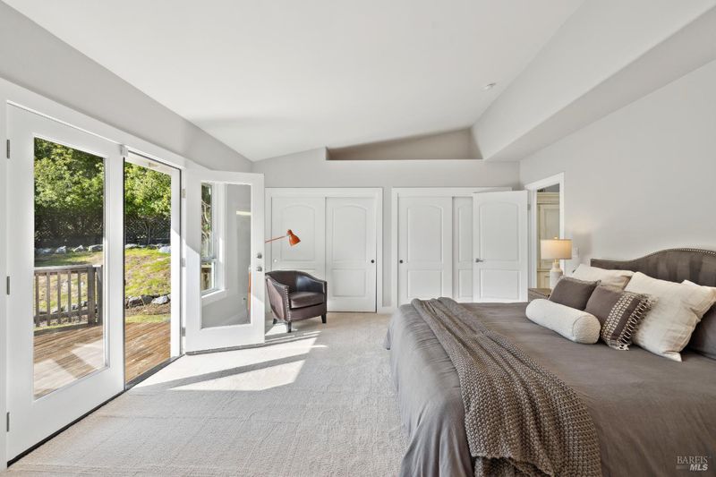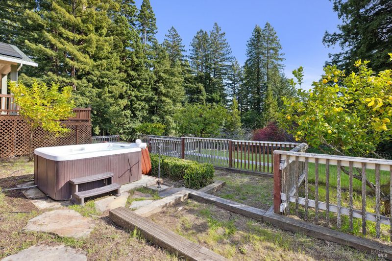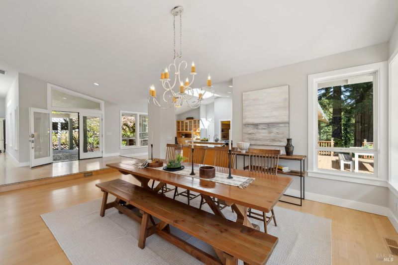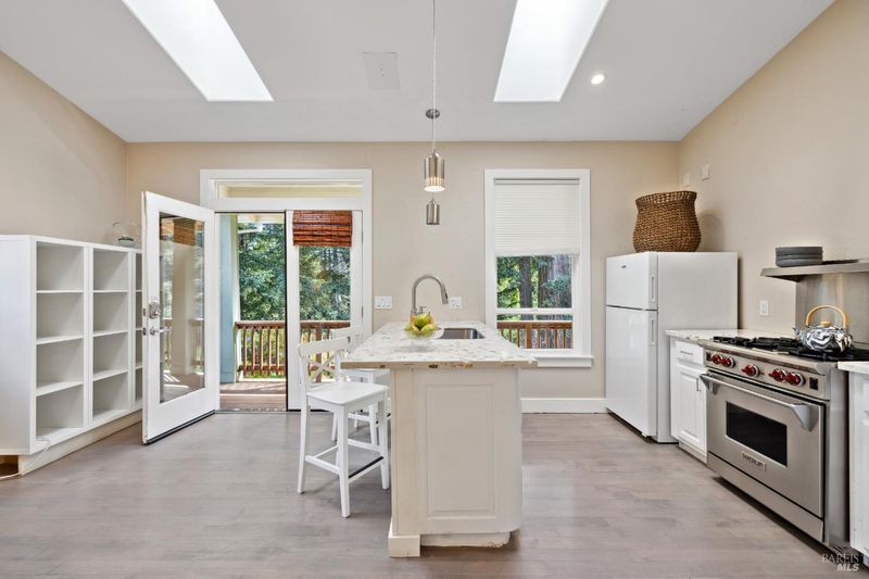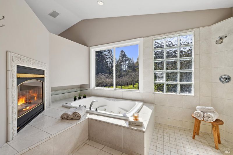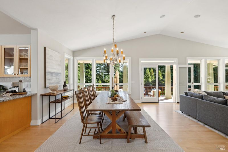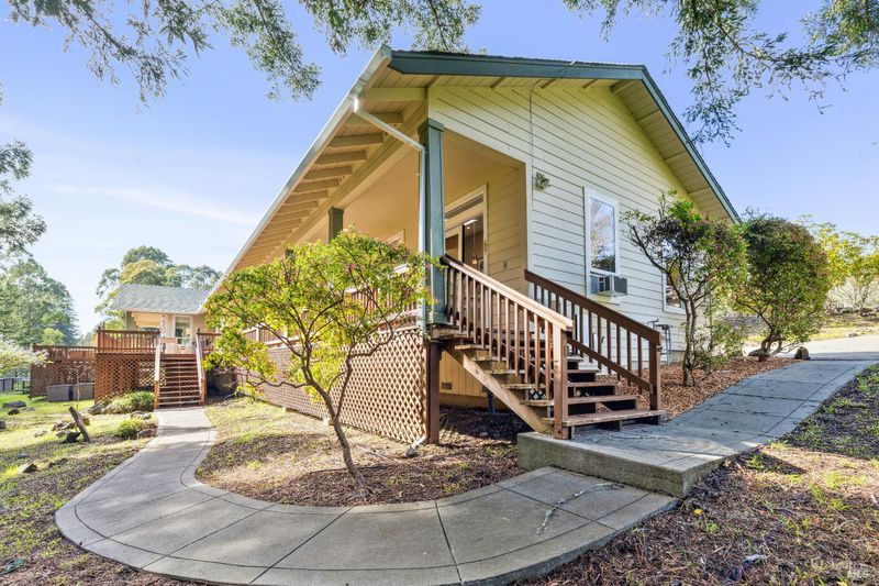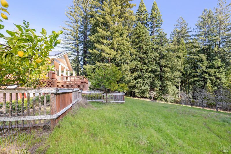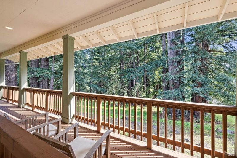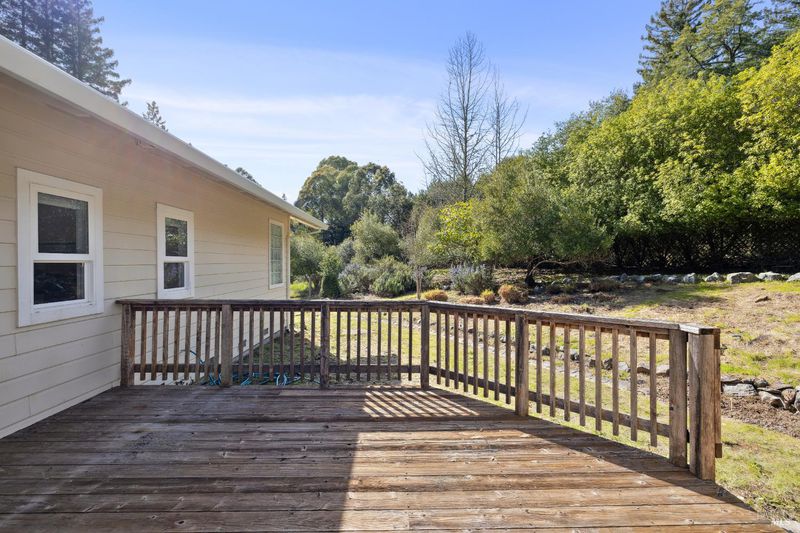 Surrounded by towering redwoods, this 5-acre property offers a stunning natural landscape with the perfect mix of shade and sun. A mature orchard features 75 fruit trees, including the famous Gravenstein apple, and the front meadow offers an abundance of delicious blackberries in the summer and fall. As you enter the home, a large covered porch greets you as you make your way towards the entry. Inside, you'll find an expansive living area with high ceilings and abundant natural light. The kitchen boasts granite countertops, custom cabinetry and premium appliances. The primary suite is a tranquil retreat with high ceilings and doors opening onto the deck. The ensuite bathroom provides a spa-like experience with two separate vanities, a soaking tub and a large walk-in shower. A spacious second bedroom features its own bathroom with a large vanity, and a separate shower and water closet. An additional den/flex space features a desk area and French doors leading to the patio. An additional unique feature of this home is the private legal studio perfect for guests. Modern amenities include high-speed internet, solar, and Tesla Powerwall. The close proximity Occidental and Bodega Bay makes this home an incredible find.
