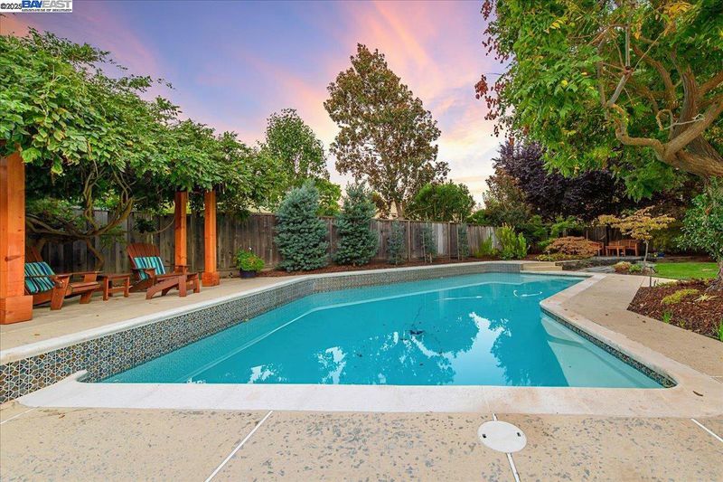 Beautifully renovated west-facing home in the heart of the highly desirable Pleasanton Valley neighborhood! Step through the leaded glass front door to find Brazilian Cherry wood floors and a formal living room with vaulted ceiling that flows seamlessly into the dining room, highlighted by a custom lighted built-in cabinet. This spacious home features a convenient full bedroom and bath on the main level, plus a stunning granite kitchen with rich Cherry wood cabinetry, stainless steel appliances including a gas range, refrigerator, and built-in microwave. The kitchen opens to the inviting family room with a cozy wood-burning fireplace, creating the perfect space for everyday living and entertaining. Updated bathrooms showcase stylish new cabinetry, fixtures, lighting, and tile flooring. Thoughtful upgrades include newer HVAC, water heater, dual-pane windows, Plantation shutters, and fresh exterior paint for added peace of mind. Outside, enjoy your private backyard retreat with a large patio for entertaining, a sparkling pool, and a wisteria-covered arbor offering shaded relaxation. A second garden patio beneath mature trees provides even more room to unwind. Walk to nearby parks and award-winning K-12 schools, with easy access to 680/580, BART, and ACE train. This one has it all!