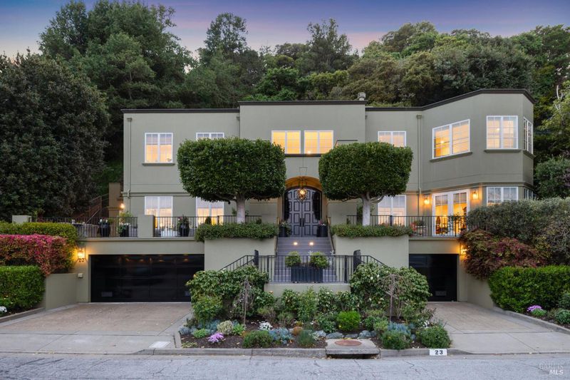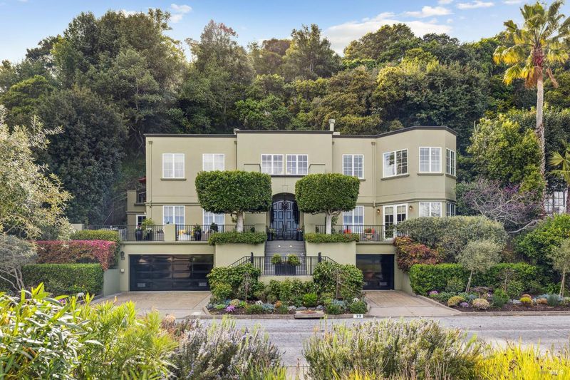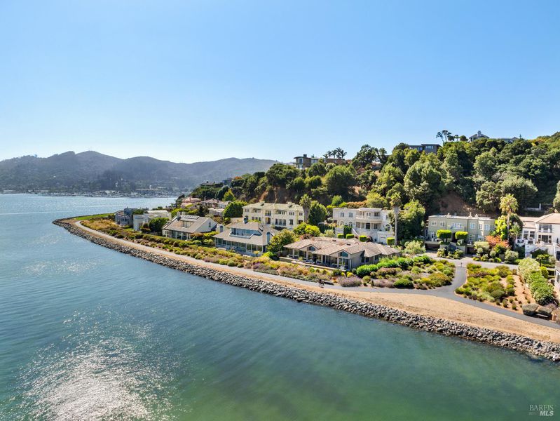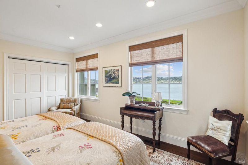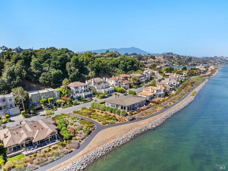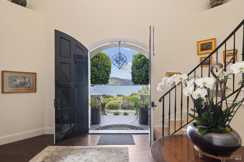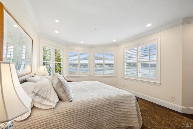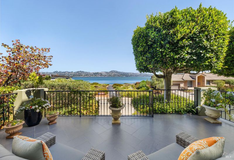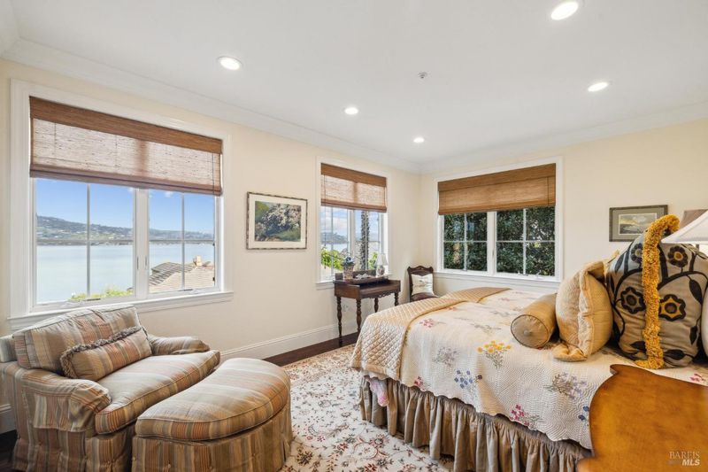 Situated within an exclusive enclave of custom homes, this impressive residence features breathtaking views of the bay, impeccable design, and an idyllic setting. This exceptional residence has been renovated to the highest of standards, showcasing extraordinary quality, craftsmanship, and unsurpassed attention to detail throughout. An elevator connects all levels of the residence, with access points in the garage, the main level, and the upper level. Updated hardwood floors throughout the residence. The living room showcases a series of windows framing views of the bay and French doors opening to the entertainment deck. The light-filled family room features built-in cabinetry, a gas-start fireplace, and access to the deck. The large chef's kitchen features a peninsula with counter seating, a center island, soapstone countertops, a pantry, high-end stainless steel appliances, and an inviting breakfast nook. A main-level ensuite bedroom provides comfort and flexibility. A curved staircase leads to the upper level, which features the comfortable primary suite, an additional ensuite, two bedrooms, a full bath, and a laundry room. Directly across the street, a protected waterfront lot preserves bay views and offers access to the shoreline pathway. Three-car garage and EV charger.