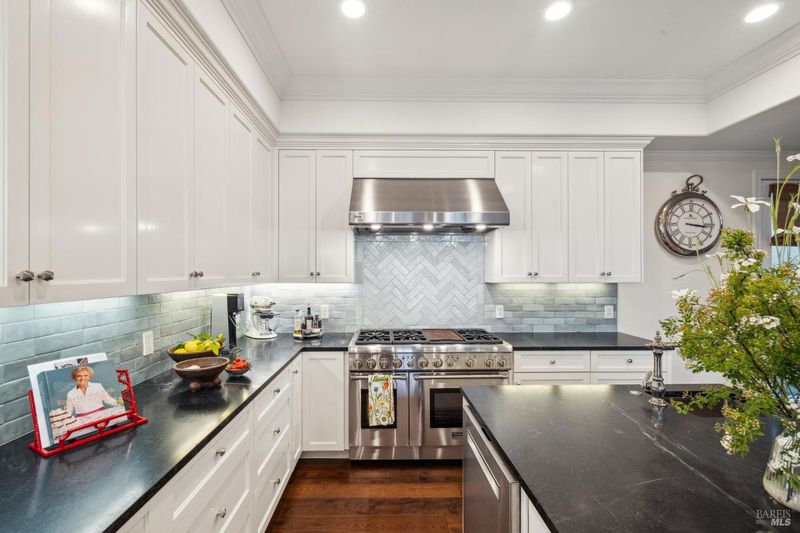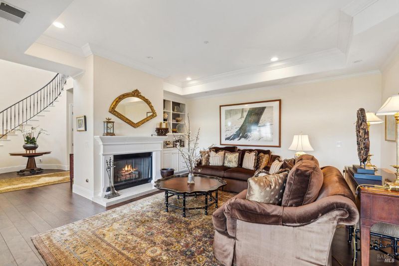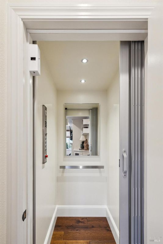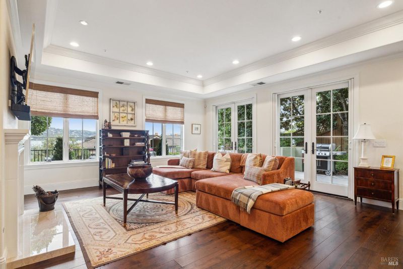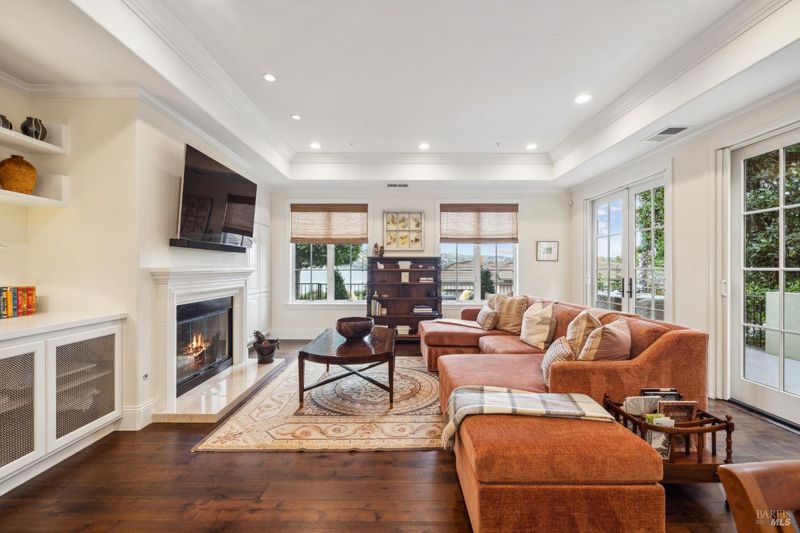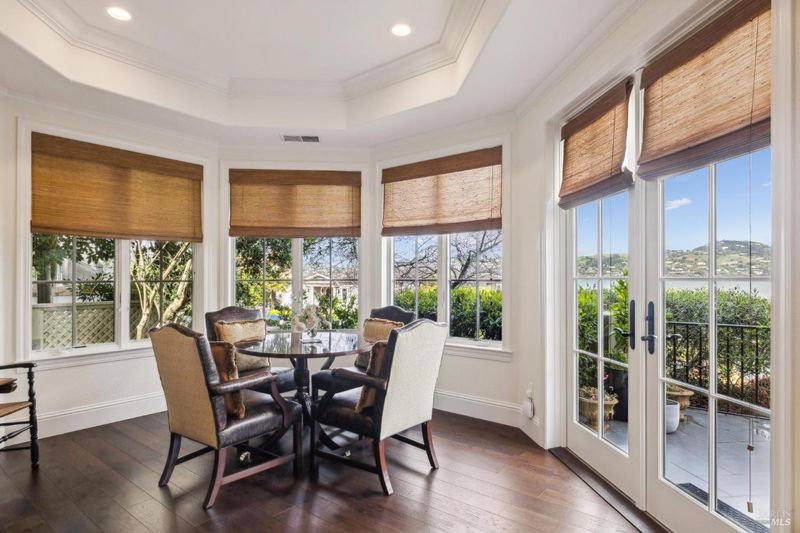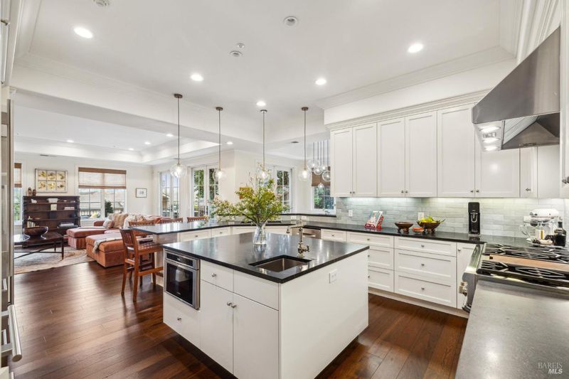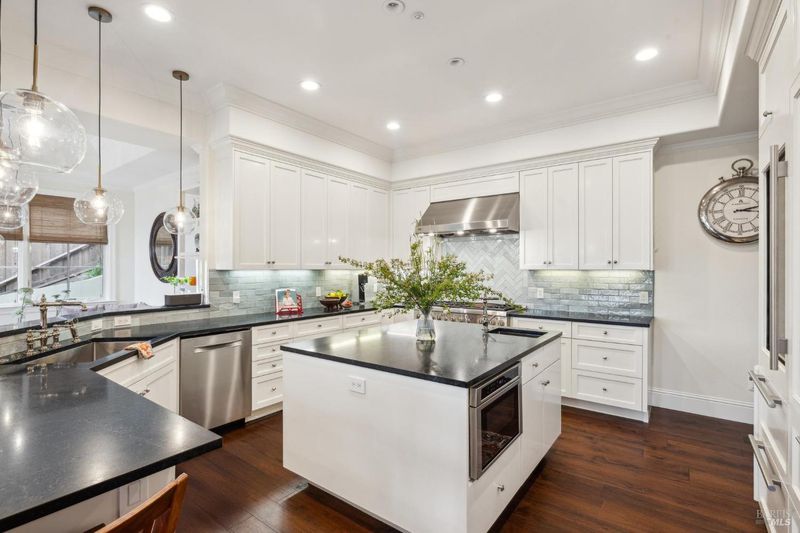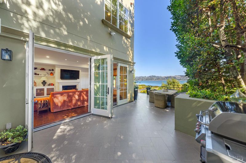 Situated within an exclusive enclave of custom homes, this impressive residence features breathtaking views of the bay, impeccable design, and an idyllic setting. This exceptional residence has been renovated to the highest of standards, showcasing extraordinary quality, craftsmanship, and unsurpassed attention to detail throughout. An elevator connects all levels of the residence, with access points in the garage, the main level, and the upper level. Updated hardwood floors throughout the residence. The living room showcases a series of windows framing views of the bay and French doors opening to the entertainment deck. The light-filled family room features built-in cabinetry, a gas-start fireplace, and access to the deck. The large chef's kitchen features a peninsula with counter seating, a center island, soapstone countertops, a pantry, high-end stainless steel appliances, and an inviting breakfast nook. A main-level ensuite bedroom provides comfort and flexibility. A curved staircase leads to the upper level, which features the comfortable primary suite, an additional ensuite, two bedrooms, a full bath, and a laundry room. Directly across the street, a protected waterfront lot preserves bay views and offers access to the shoreline pathway. Three-car garage and EV charger.