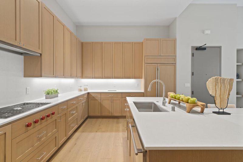 - Countertop - Quartz, Dishwasher, Garbage Disposal, Hood Over Range, Island with Sink, Microwave, Oven Range - Built-In, Pantry