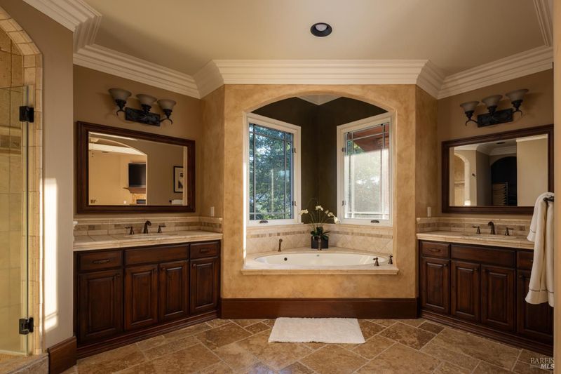 - Double Sinks, Multiple Shower Heads, Soaking Tub, Stone, Tile, Window