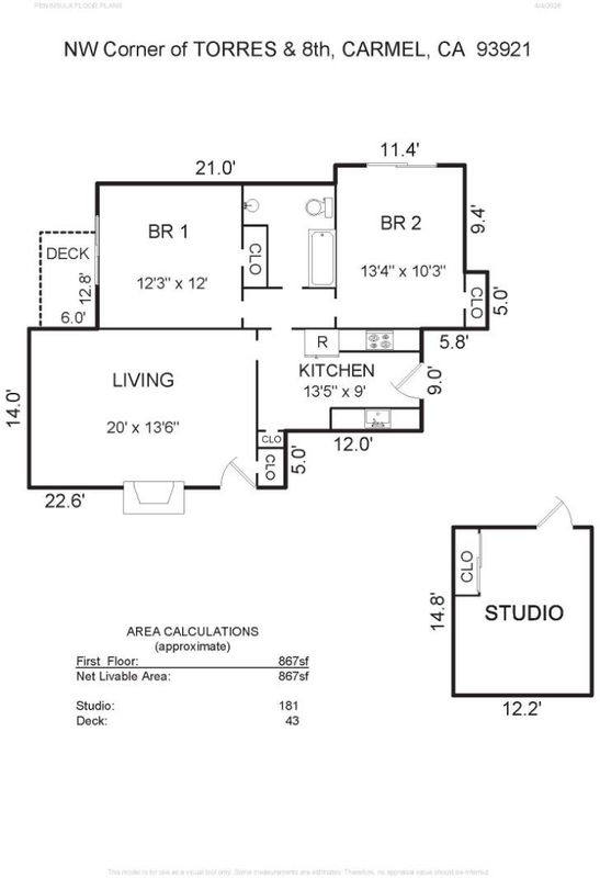 Welcome to a rare original 1931 cottage in Carmel by the Sea. This cozy residence offers 867 square feet of living space on a 6,000 sf lot, with 2 bedrooms and a bathroom. The open living area features a dining space within the living room, a large wood burning fireplace, high coffered ceilings, and hardwood floors. The primary bedroom has rustic redwood high beamed ceilings and glass doors leading out to a deck. The kitchen has all the essentials, a fabulous large pantry, and a Dutch door going out to the back yard. There's an out building with power which could be an office, artist studio, or simply storage space and ultimately a possible ADU for guests or rental. Situated within the Carmel Unified School District and ideal for those who appreciate simplicity and charm in the heart of Carmel, it's a short 1 block stroll to town and another few blocks to the beach. You can use this adorable home as a weekend retreat or look into expansion. Carmel, as we knew it, could be yours!
