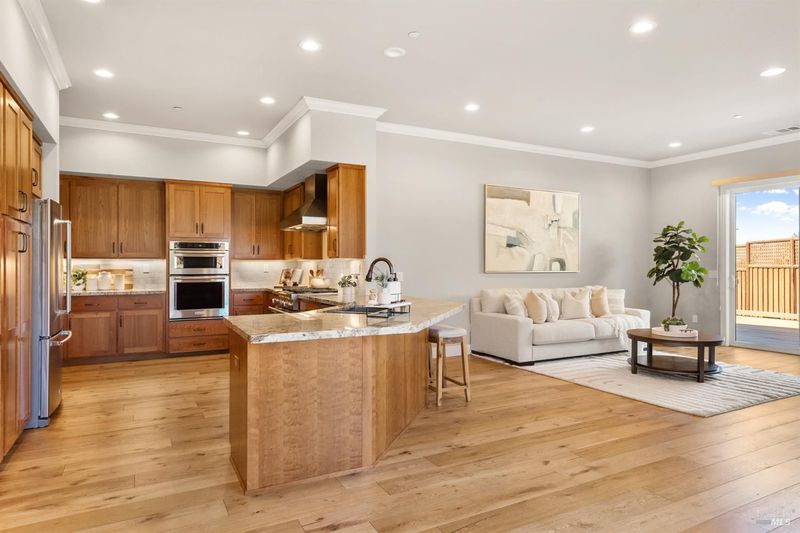 Gracious, Spacious, and All on One Level! This beautifully designed single-level home offers 2,726 +/- square feet of comfortable, stylish living space with four spacious bedrooms and three and a half bathrooms. Wide plank white oak floors and recessed lighting set a warm, inviting tone throughout the open floor plan. The kitchen is a true showpiece with stone countertops, high-end stainless steel appliances, and plenty of space to cook and gather. Just off the kitchen, a gorgeous wet bar makes entertaining effortless. The living area flows seamlessly to the backyard, where you'll find a large deck, a flat usable yard, and tranquil peek-a-boo views of Santa Rosa. The primary suite feels like a retreat with its spa-like jetted tub. Dual pane windows, central heating and air keep the home comfortable year-round, while an attached two-car garage adds convenience and storage. And with no steps anywhere in the home, accessibility and ease of living are built right in!
