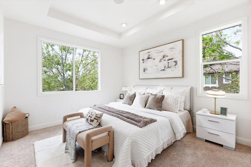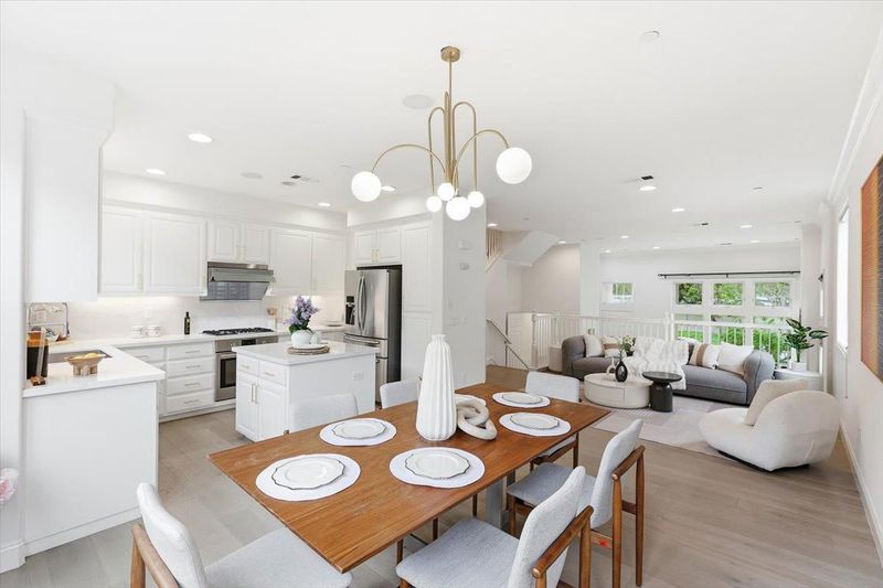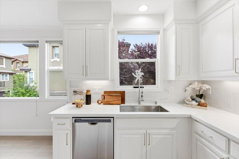 Beautiful end-unit townhome by Toll Brothers, perfectly positioned in the heart of Silicon Valley near major tech campuses. This bright and stylish Sunnyvale residence offers approximately 1,650 sq ft of thoughtfully designed living space with 3 bedrooms and 2.5 baths. Step into a light-filled living area highlighted by dramatic 13-foot ceilings and elegant front-facing windows, creating an inviting and airy ambiance. The open-concept family and dining area flows seamlessly into a beautifully upgraded chefs kitchen featuring stainless steel appliances, a Fotile range hood, gas range, and a generous island with sleek quartz countertopsperfect for entertaining and everyday living. Upstairs, unwind in spacious bedrooms, including a serene primary suite with vaulted ceilings and a spa-inspired bath complete with dual sinks, soaking tub, and separate shower. Convenient in-home laundry enhances comfort and ease. Enjoy the vibrant lifestyle with a short stroll to Seven Seas Park, and quick access to Sunnyvale Baylands Park, Levi's Stadium, and Shoreline Amphitheatre. With easy access to Highways 237, 101, and 85 and proximity to Apple, Google, Microsoft, Amazon, Meta, and LinkedIn, this is a home you wont want to miss.