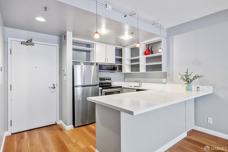 Perfect city residence in the North Waterfront neighborhood, a sunbelt location near the Bay. The building entrance has a roundabout driveway for drop offs and pickups, Parc Telegraph is a full-amenity building with 24-hour security/doorman, guest suite, modern fitness center, club room with full kitchen and bar area, and free laundry on the same floor. This East facing open floor plan has a large patio, bedroom area, living/dining room and kitchen bar. Handsome hardwood floors run throughout the unit. The open kitchen has all stainless appliances and a new quartz slab countertop. There is a bedroom alcove in this modern Junior one-bedroom residence. Parc Telegraph is located in a wonderful neighborhood nestled against historic Telegraph Hill. Underground secure parking across the street. Many conveniences within steps...grocery stores, deli, restaurants, Embarcadero. Perfect walking area. This property has it all.