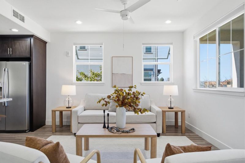 Bright south-facing end-unit with modern upgrades, offering abundant natural light, enhanced privacy, and walkable access to parks, dining, and daily conveniences. Less than 7 years new, this home features an open-concept layout with high ceilings, recessed lighting, and built-in ceiling speakers. Sunlight fills both the living areas and bedrooms throughout the day. The kitchen is designed for both functionality and style, featuring a center island with granite countertops and gas burner range, seamlessly connecting to the living and dining areas, Perfect for everyday living and entertaining. Upgraded with wood-look tile flooring in main living areas and bathroom for a clean, modern look with easy maintenance. Comfortable bedrooms include a walk-in closet, providing ample storage and a cozy retreat. Enjoy a private balcony, along with charming details such as an arched entry, decorative metal window awnings, and a welcoming paver courtyard. Convenient access to Hwy 880 & 84, and the Dumbarton Bridge, Paseo Padres Pkwy & Decoto Rd, major tech shuttle routes & UC Bart, walking distance to Ranch 99, restaurants, N Gate Community Park & Grandal Greek Park. Located in highly sought after award-winning school district: Patterson Elementary (8) Thornton Middle (9) American High (10).