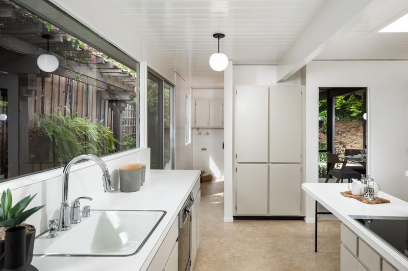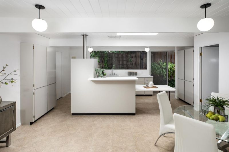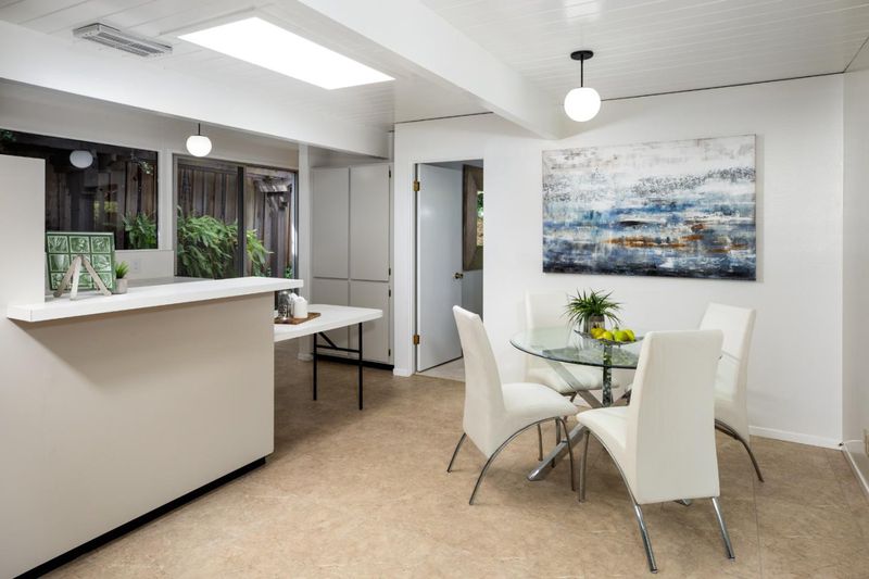 Welcome to this sleek mid-century modern home. Enter through the open-air atrium foyer which allows light to the center of this beautifully built Eichler home. One is greeted by the bright & contemporary living room with a wall of windows, floor-to-ceiling brick fireplace, white washed wood ceiling & dramatic post-&-beam architecture. Adjoining is the dining area with a sophisticated mid-century lighting fixture & views of the pristine garden. Open eat-in kitchen with a center island, skylight, globe lighting & spacious pantry. Adjacent to a convenient laundry area & access to the attached two-car garage. The property has been enhanced with fresh interior & exterior paint, new carpeting & lighting fixtures. The primary bedroom has access to the rear yard, walk-in closet, plus bathroom with new vanity, flooring and lighting. Tucked on a quiet cul-de-sac in coveted Ortega Park, on a private lot with mature landscaping, radiant heat, walls of glass & open-air atrium taking advantage of California's indoor/outdoor lifestyle. Top-rated schools: Stocklmeir Elementary, Cupertino Middle & Fremont High School. In close proximity to schools, Caltrain & Apple Park. A rare opportunity to own a preserved Eichler with timeless minimalist appeal and modern amenities.